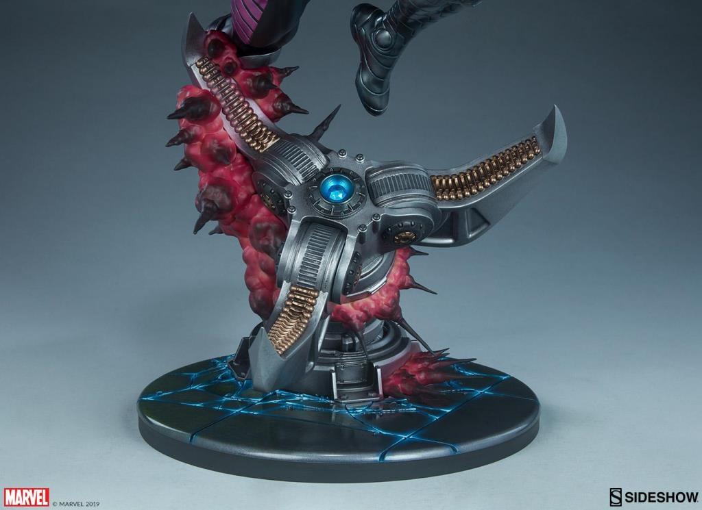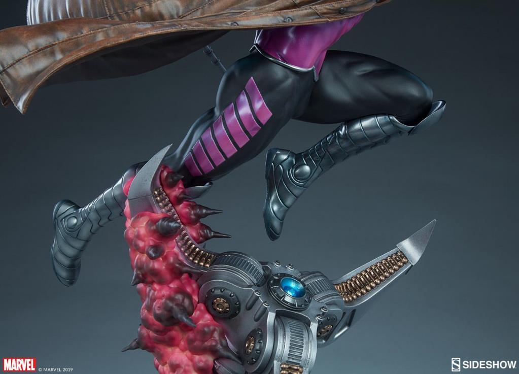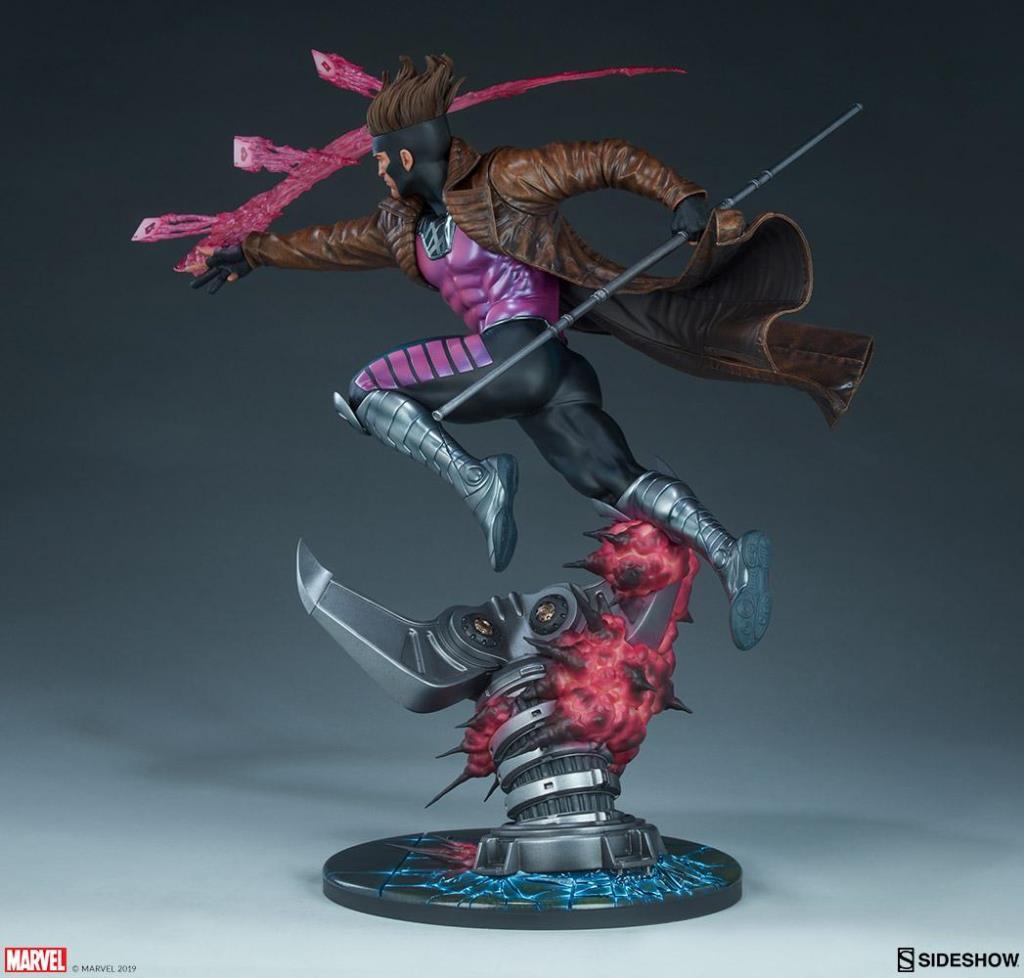 A z g ı n Cajun Tehlike Odası üssünden çıkan dev bir mekanik pençe için savaşa girerken Gambit Maquette 21" boyunda. Remy LeBeau, X-Men arkadaşının yardımına koşarak, bo asasını tutarak ve birkaç şarjlı oyun kartını savaşa fırlatırken, silahtan mor kinetik enerji patlamaları patlar.