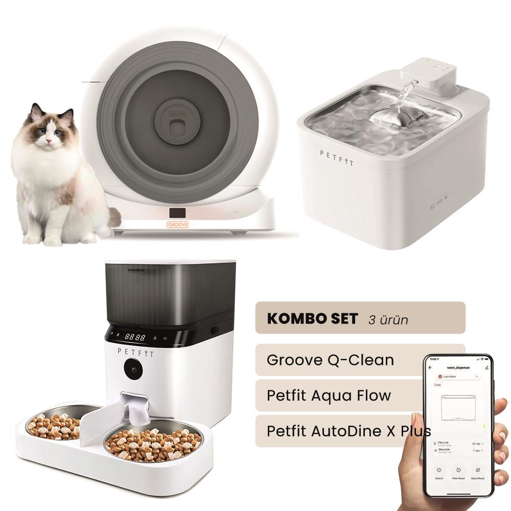 Groove Q-Clean Akıllı Otomatik Kedi Tuvaleti Gri - Petfit Aqua Flow Akıllı Bataryalı Su Pınarı Çeşmesi + Petfit AutoDine X Plus Akıllı Otomatik Mama Kabı Bundle