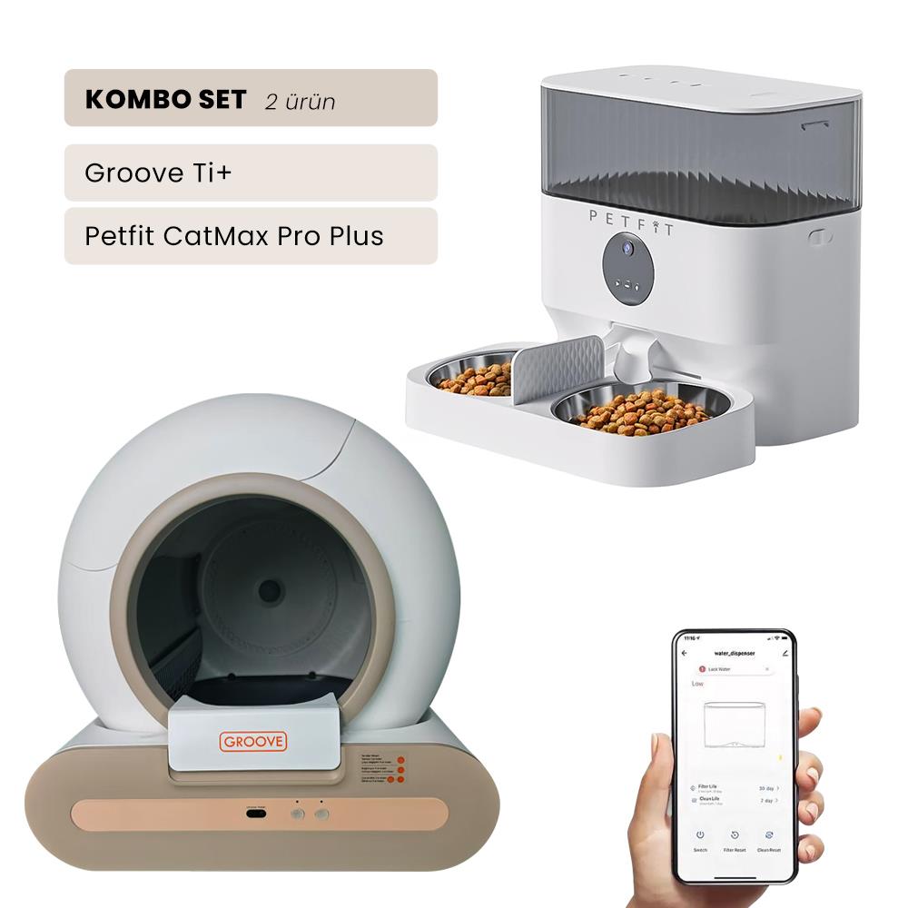 Groove Ti+ Wi-Fi Akıllı Otomatik Kedi Tuvaleti Kahverengi + Petfit CatMax Pro Plus 5L Wi-Fi Kameralı Akıllı Otomatik Mama Kabı Besleme Ünitesi Bundle