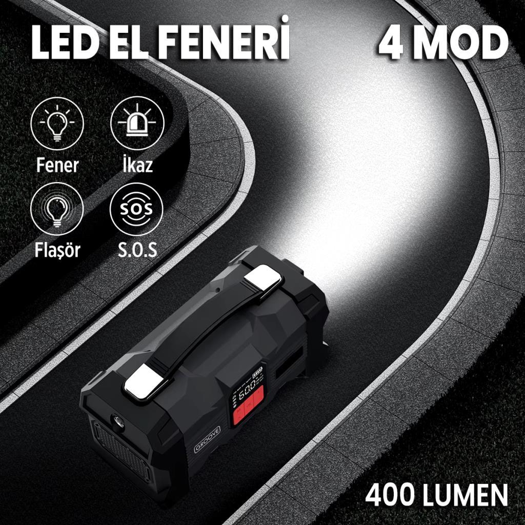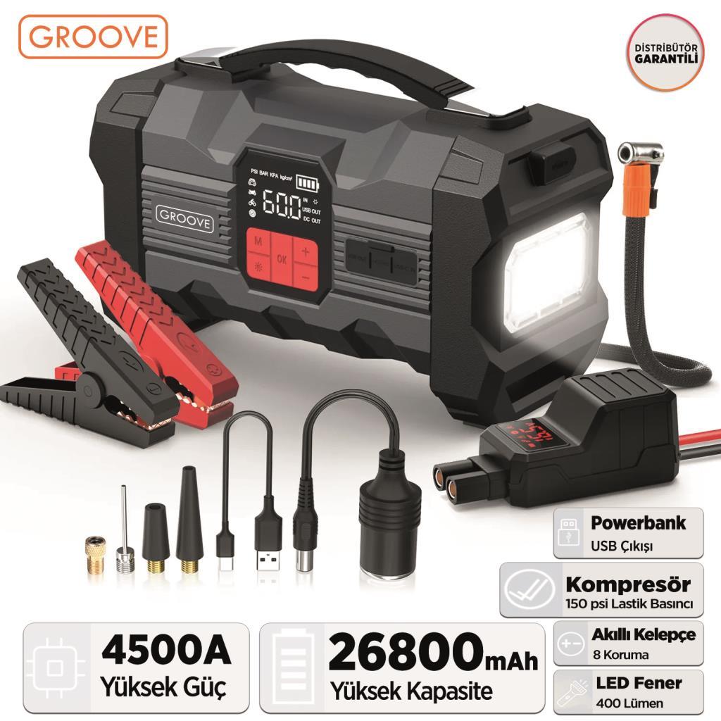 GROOVE ZK004 26800mAh 4500A Akü Takviye Cihazı +Lastik Şişirme Kompresörlü Taşınabilir Jump Starter (Kompresör+Powerbank+Led Lamba+LCD Ekran)