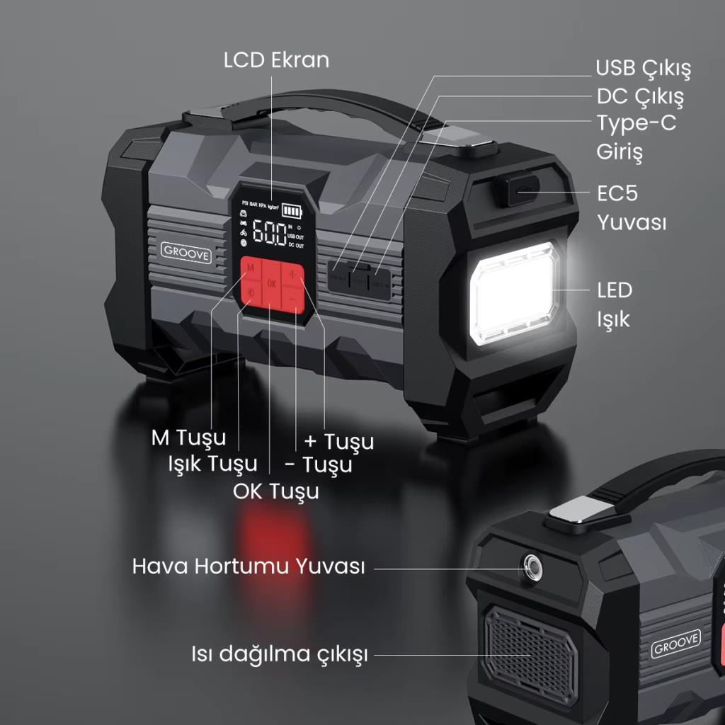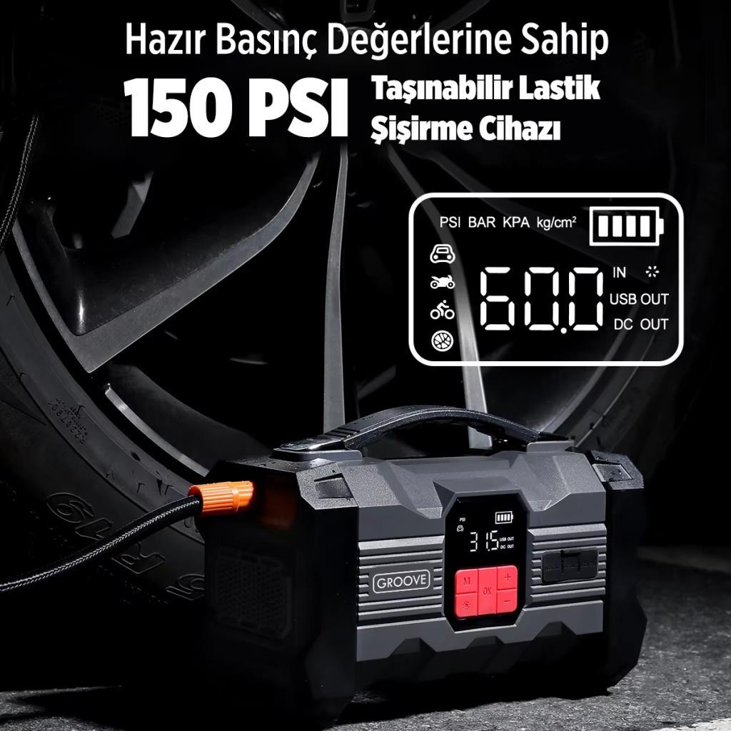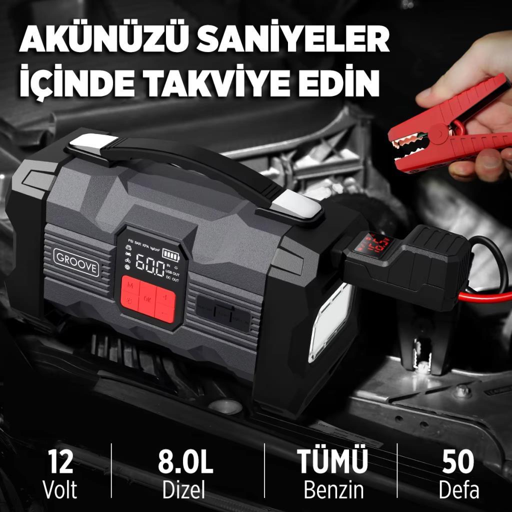 GROOVE ZK004 Akü Takviye Cihazı + Lastik Şişirme Kompresörlü Taşınabilir Jump Starter