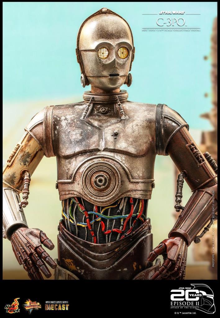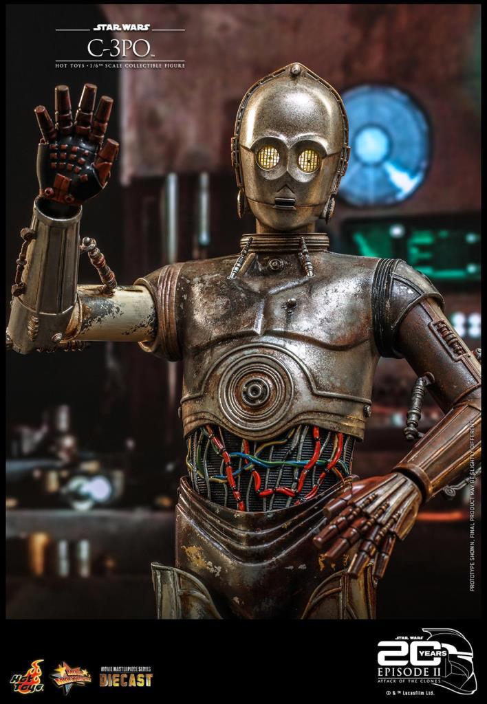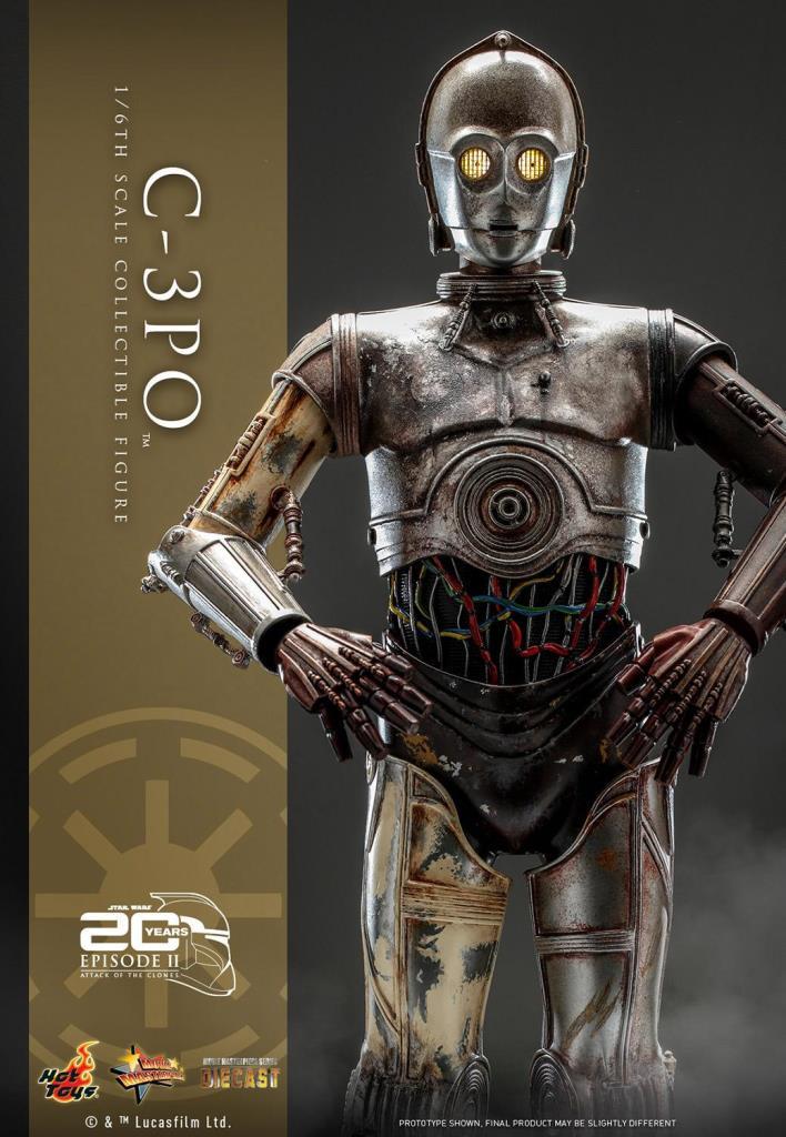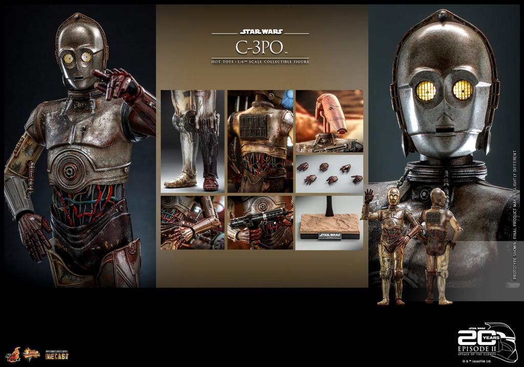 Yepyeni C-3PO Altıncı Ölçekli Koleksiyonluk Figür, döküm malzemeden ustaca hazırlanmış olup, muhteşem hava koşullarına dayanıklı efektlere sahip ayrıntılı mekanik tasarıma, LED ışıklı gözlere, bir patlayıcıya, değiştirilebilir bir Savaş Droid kafasına, bir figür tabanına ve özel tasarlanmış bir hatıra eşyasına sahiptir. ambalajlama!