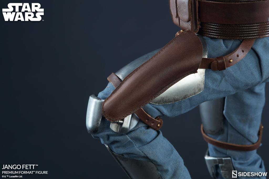 Jango Fett Premium Format ™ Figüründe Mandaloryalı zırh, Z-6 jetpack bulunuyor ve bir çift WESTAR-34 patlatıcı kullanıyor.