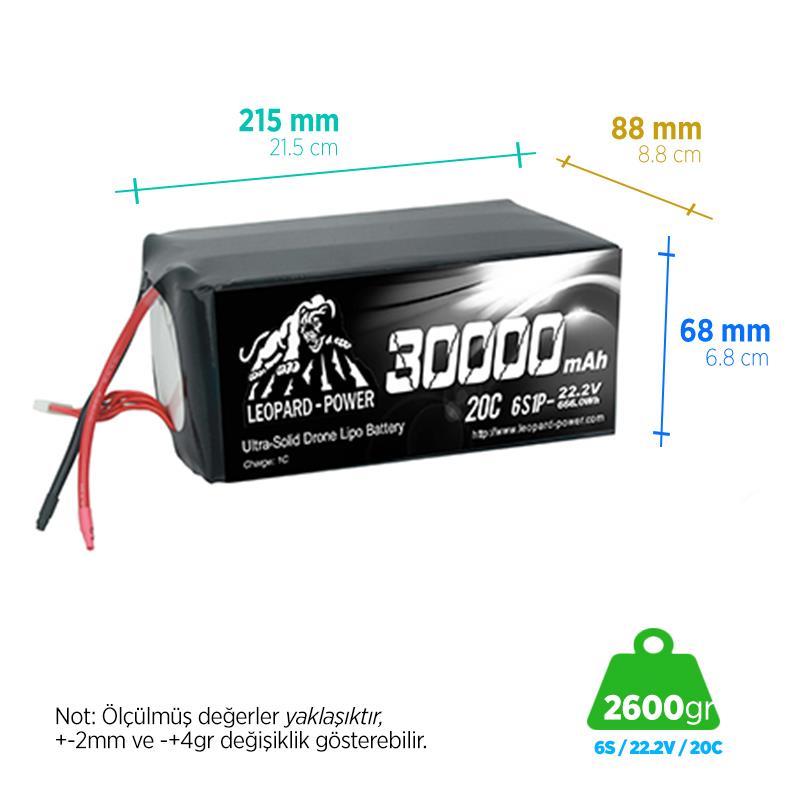 Genel Özellikleri Türü: Solid-state drone Li-Po Battery Model numarası .: 30000mAh / 22.2V / 20C Minimum Kapasite: 30000mAh Yapılandırma: 6S / 22.2 V/ 6 Cells Sürekli Deşarj Akımı: 20C(600A) Şarj Hızı: 1C Ağırlığı: 2.6 KG Boyutu: yakl. En 215mm x boy 88mm x yükseklik 68mm