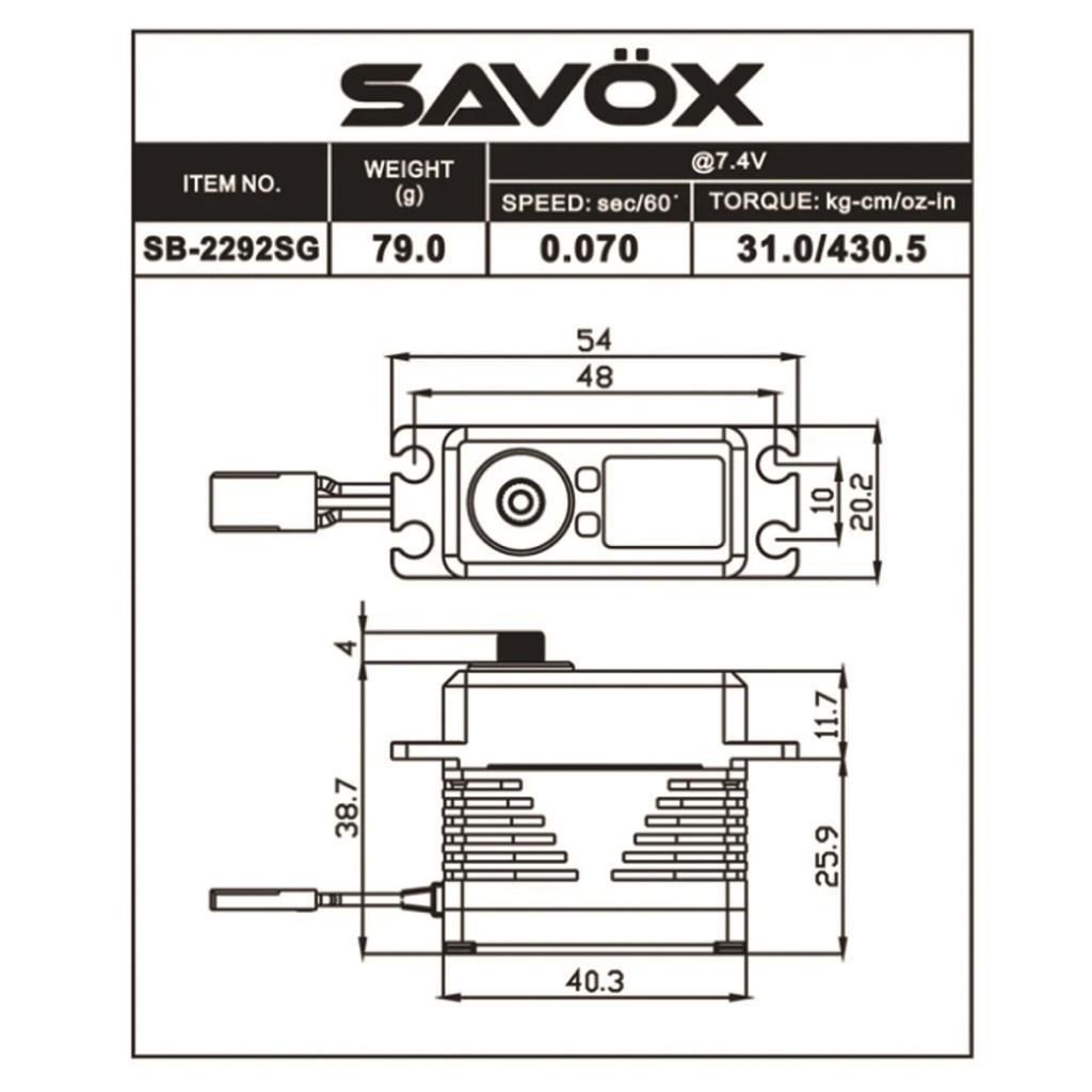 6v'da Tork 22,0kg/305,5oz-in 7,4v'da Tork 31,0kg/430,5oz-in 8,4v'da Tork 45,0kg/624,9in 6v'da Hız 0,085 sn/60 derece 7,4v'da Hız 0,07sn/60 derece 8,4v'da Hız 0,055sn/60 derece Boyutlar U x G x Y mm: 40,3 x 20,2 x 38,7 Ağırlık: 81g Çalışma Sıcaklığı: 14° - 122°F (-10° - 50°C) Çalışma Akımı (yüksüz): 180mA @6.0V, 220mA @7.4V Durdurma Akımı (kilitliyken): 7500mA @6.0V, 9200mA @7.4V Boşta Akım: 5mA @4.8V, 5mA @6.0V Kablo Uzunluğu: 300 +/- 5mm Çıkış Dişli Yivli: 25 Diş Rulmanlar: 2BB Çalışma Hareketi: 100° (1000 › 2000 µ saniye) Nötr Pozisyon: 1500 µ saniye Darbe Genişliği Aralığı: 800 › 2200 µ saniye Maksimum Hareket: Yaklaşık 130° (900 › 2100 µ saniye) Yenileme Hızı: 333 Hz Motor Tipi: Fırçasız SAVOX Orjinal ürün güvencesiyle