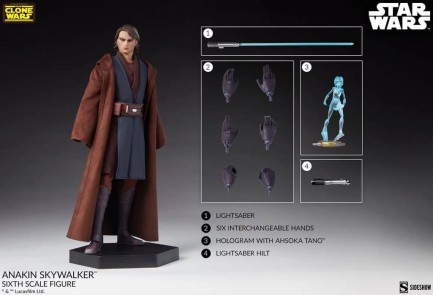 Anakin Skywalker Altıncı Ölçek Figürü, koleksiyonculara Jedi generali için çok çeşitli görüntüleme seçenekleri sunmak için bir dizi stilize eller ve değiştirilebilir aksesuarlar içerir. Anakin Skywalker, bir çift kavrama eli, bir çift nötr el, bir çift kuvvet eli ve çok çeşitli hareket ve poz kombinasyonları için bir çift yumruk dahil olmak üzere dört çift stilize el ile birlikte gelir. Buna ek olarak, hem bir ışın kılıcı kabzasıyla hem de savaş eylemi için serbest bırakılmış mavi sivri uçlu bıçağıyla birlikte gelir. Son olarak Anakin, Padawan'ıyla iletişim kurmak için yontulmuş Ahsoka Tano™ hologramına sahip bir holoprojektör aksesuarı içerir.