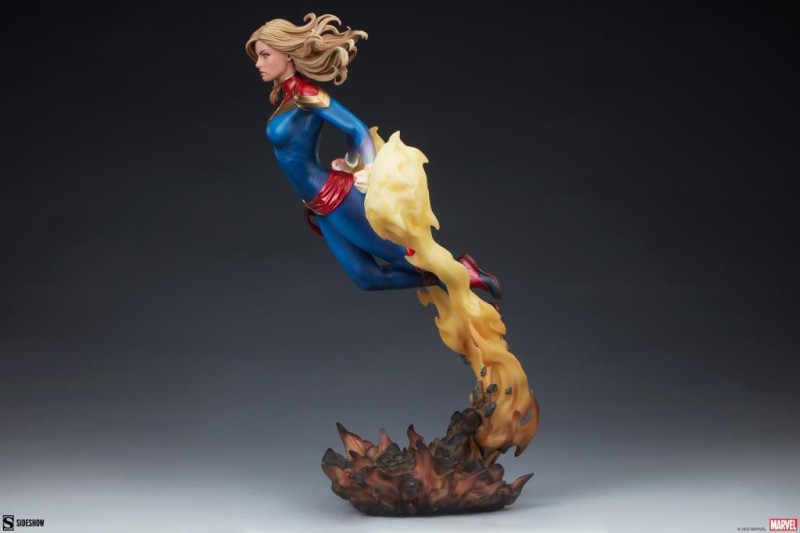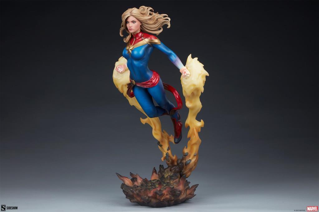 Kaptan Marvel Premium Format Figürü 23,75 inç boyunda ve 13,25 inç genişliğinde olup yarı Kree kahramanı yer çekimine meydan okur ve iki foton enerjisi patlamasıyla havaya fırlatılırken arkasından molozlar fışkırır. Avengers takım arkadaşları tarafından zaman zaman "Parlak Yumrukçular" olarak anılan Carol Danvers, üniformasındaki Hala yıldızı kadar parlayarak gücü ve tutkusuyla gökyüzünde delikler açmaya hazır.