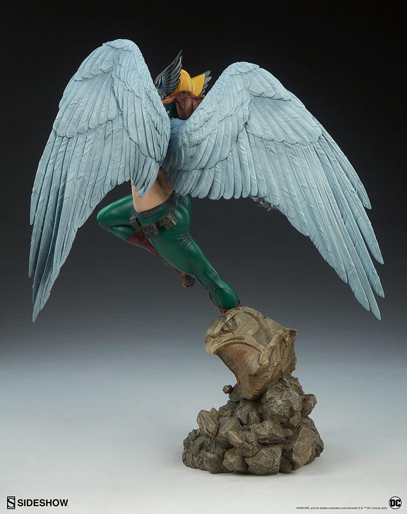 Hawkgirl Premium Format ™ Figürü, kuş kahramanı bir şahin idolün parçalanan başıyla Mısır tapınağı temalı bir üssün üzerinde yükselirken 22 inç uzunluğundadır. Efsanevi savaşçı, kanatlarını genişçe açarak, mistik N'inci metal topuzunu sallayarak adaleti sağlamak için uçuyor.