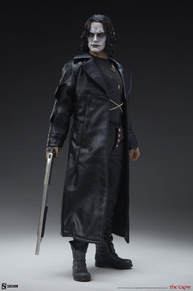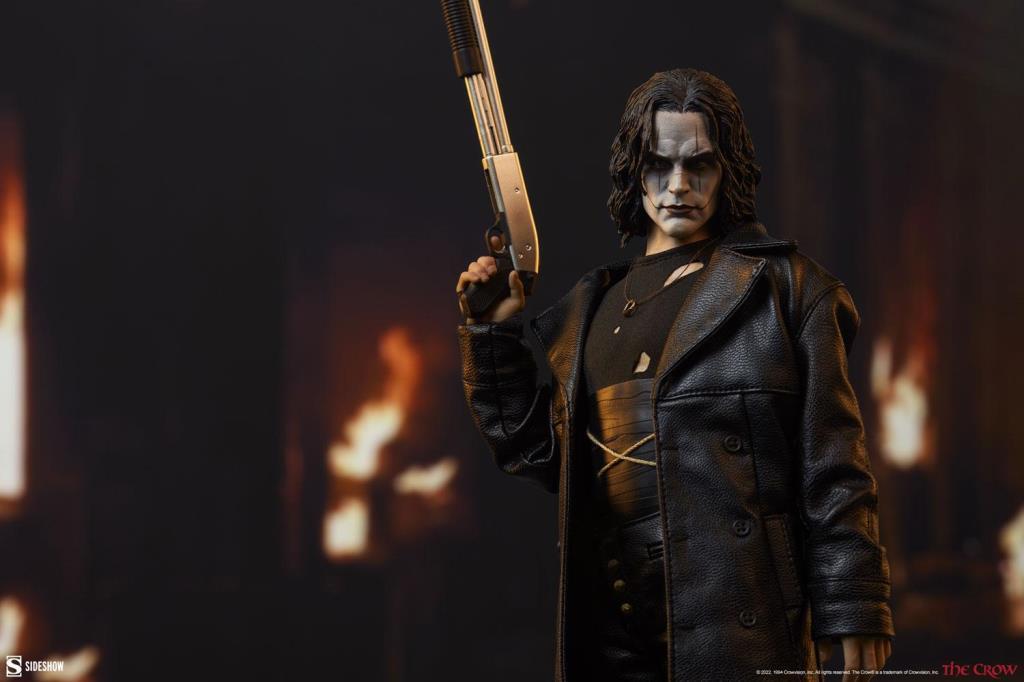 Karga Altıncı Ölçek Figürü, The Crow filmindeki Eric Draven rolünde aktör Brandon Lee'nin ayrıntılı bir benzerliğini sunar. Dirilmiş ve intikam almaya hazır, yırtık bir trençkot, delikli ve sargılı uzun kollu bir gömlek, pantolon ve nişanlısının yüzüğünü kalbine yakın tutan bir kolyeden oluşan özel siyah kumaş bir kostüm giyiyor. Bir çift yontulmuş botla tamamlanan ölümsüz anti-kahramanın imzalı görünümü, o kader Şeytan Gecesi'nin kasvetli trajedisini yakalar.