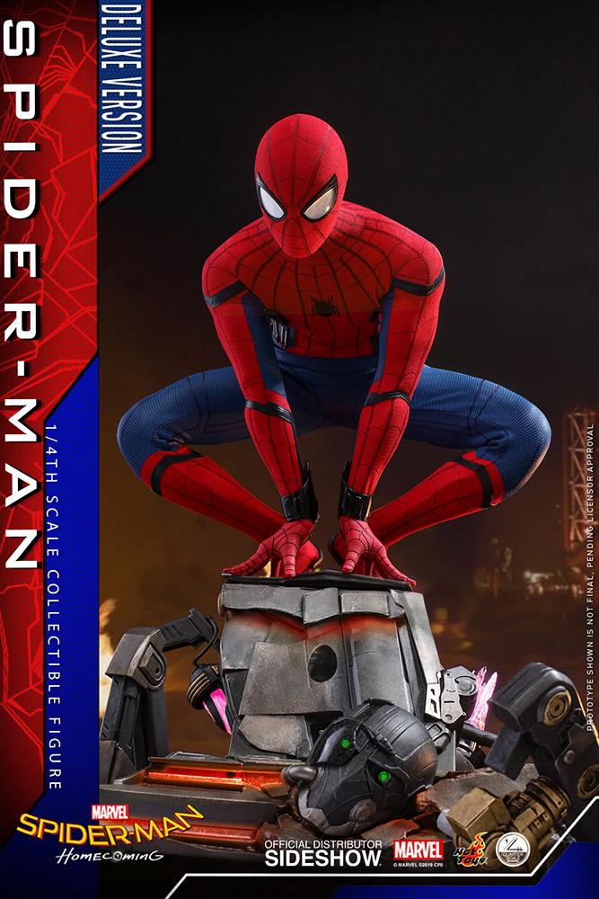 Ekran doğruluğunda 1:4 ölçekli Spider-Man koleksiyon figürü, Tony Stark tarafından Peter Parker'a verilen savaş kıyafeti temel alınarak hazırlanmıştır ve Spider-Man'in sayısız ifadesini oluşturmak için beş çift değiştirilebilir göz merceğiyle yeni geliştirilmiş maskeli bir kafa heykeline sahiptir. . Yeni geliştirilen değiştirilebilir kafa heykeli, Tom Holland'ın olağanüstü bir benzerliğine sahiptir. Bu figür, yaklaşık 43,5 cm boyunda yeni geliştirilmiş özel bir gövdeye, ustalıkla dikilmiş ve son derece ayrıntılı bir kostüme, bir çift manyetik olarak takılabilen ağ kanatlarına, bir Örümcek Drone, bir projeksiyon haritası, bir akıllı telefon, bir sırt çantası da dahil olmak üzere bir dizi aksesuara sahiptir. , Örümcek Adam maskesi, çeşitli örümcek ağı çekim efekti parçaları ve Örümcek Adam ile Akbaba arasındaki son dövüş sahnesinden ilham alan alternatif gösterim için iki aydınlatma moduna sahip LED ışıklı diorama figür tabanı.