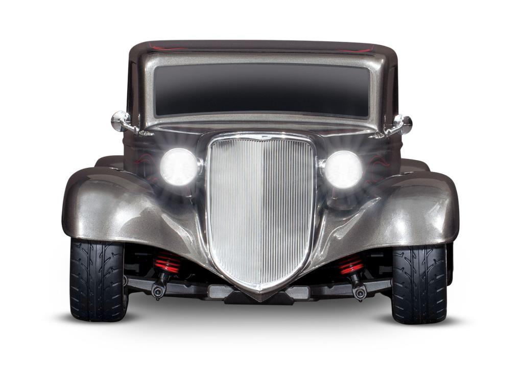 Dik eğimli bir krom ızgara, uzun dar kaportaya ve agresif bir şekilde kesilmiş tavana akar. Krom farlar, şekillendirilmiş çamurlukları tam koşu tahtalarıyla çevreliyor. Derin, parlak boya ve vahşi grafikler paketi tamamlar. Görünüm tamamen klasik bir hot rod ve Traxxas bu zamansız stili 1/10 ölçeğinde hayata geçiriyor.
