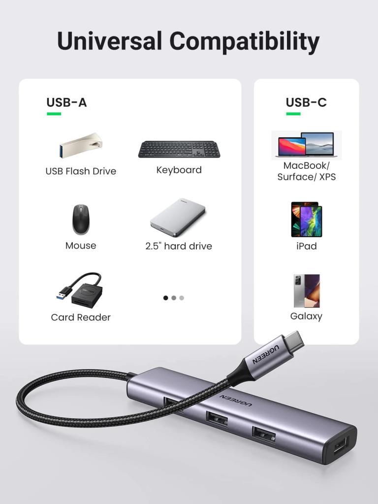UGREEN USB C Hub Cihazınızın USB-C bağlantı noktasını veya Thunderbolt 3/Thunderbolt 4'ü USB Flash sürücü, Fare, Klavye, Yazıcı veya diğer USB Çevre Birimleri için destekler dahil olmak üzere 4 standart USB 3.0 dişi bağlantı noktasına genişletir.