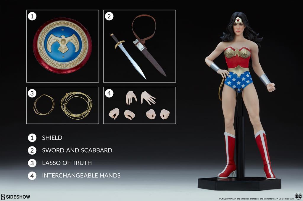 Amazon'un ikonik çizgi roman görünümünden ilham alan Wonder Woman Sixth Scale Figure, TB League tarafından geliştirilen kusursuz, eklemli, kaslı bir vücut tipinin yanı sıra Wonder Woman'ın ikonik kırmızı ve mavi renklerinde beyaz yıldızlara sahip kumaş bir bodyye sahiptir. Takım elbisenin üzerinde, kendisine özel zırhı olan oymalı bir altın kemer ve altın göğüs zırhı var. Portresi, hareketli detaylarla şekillendirilmiş, dalgalı siyah saçlara sahiptir ve ayrıca ortasında kırmızı bir yıldız bulunan altın tacı vardır.